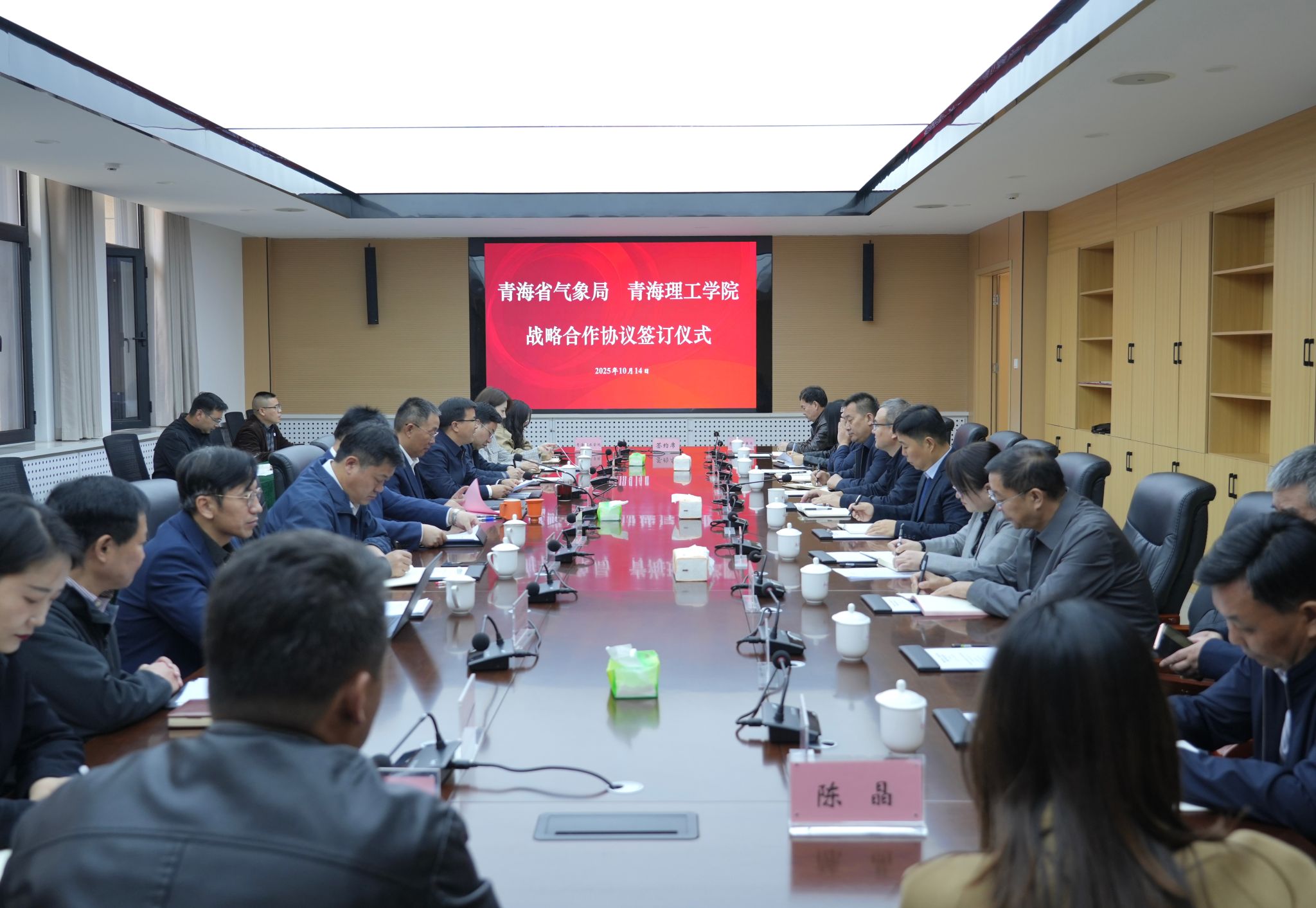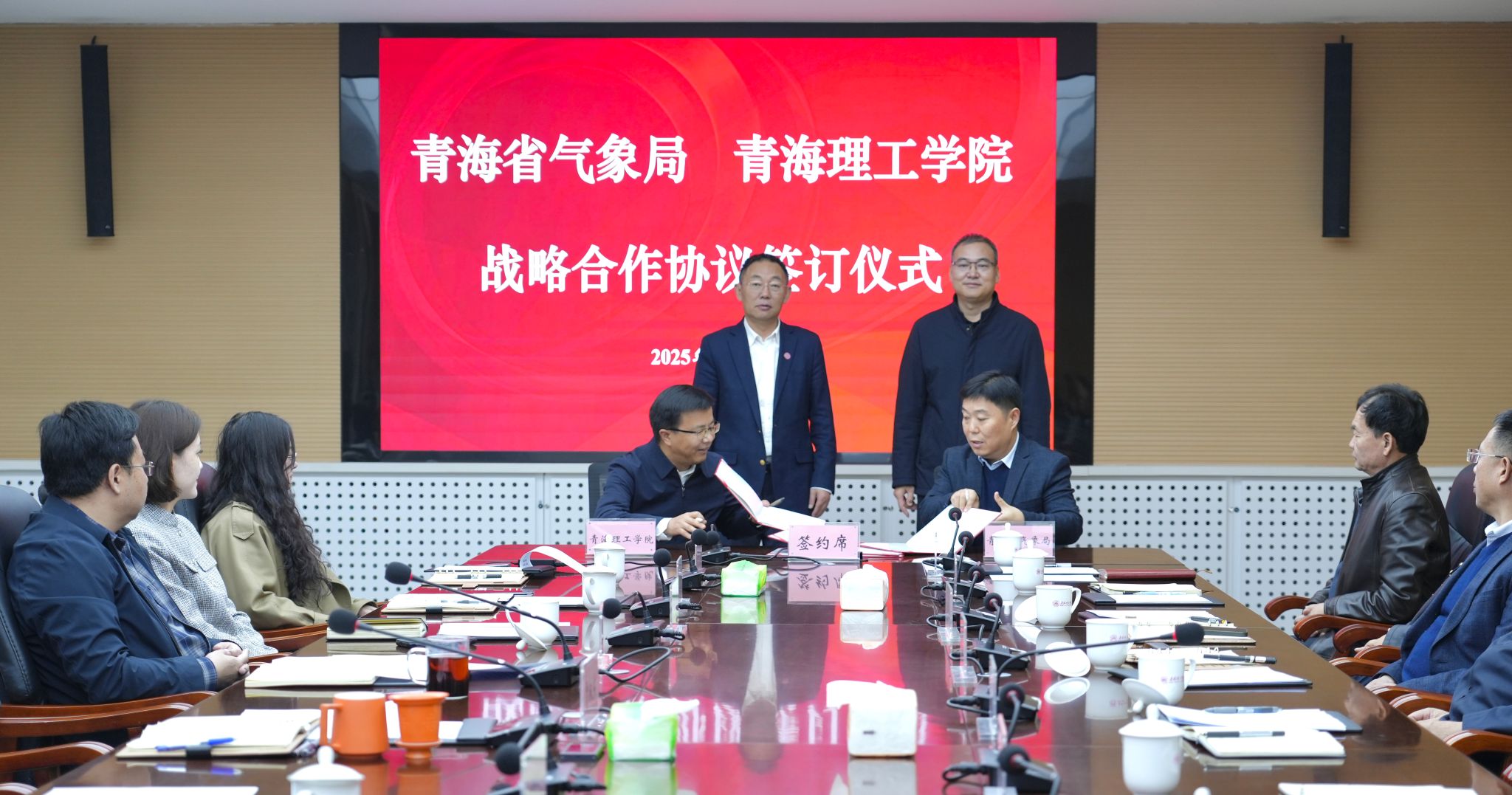 10月14日,青海省气象局与青海理工学院战略合作协议签订仪式在我校举行。青海省气象局党组书记、局长高润祥和我校党委副书记、校长贾叙东出席,省气象局党组成员、纪检组长布亚林和我校党委委员、副校长马志明代表双方签订协议,双方相关职能处室、内设机构和青海省气象科学研究所、西宁市气象局负责同志参加。