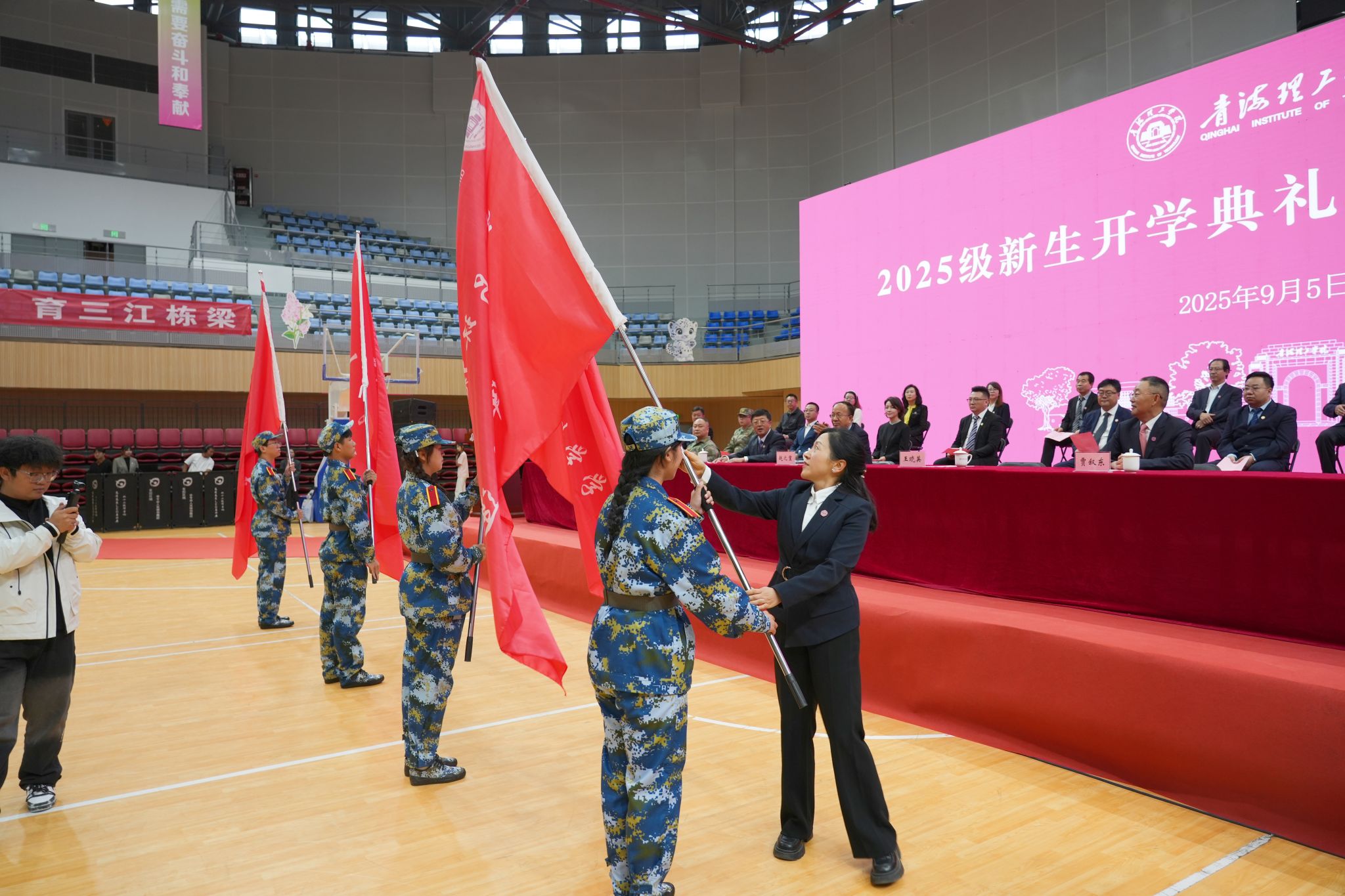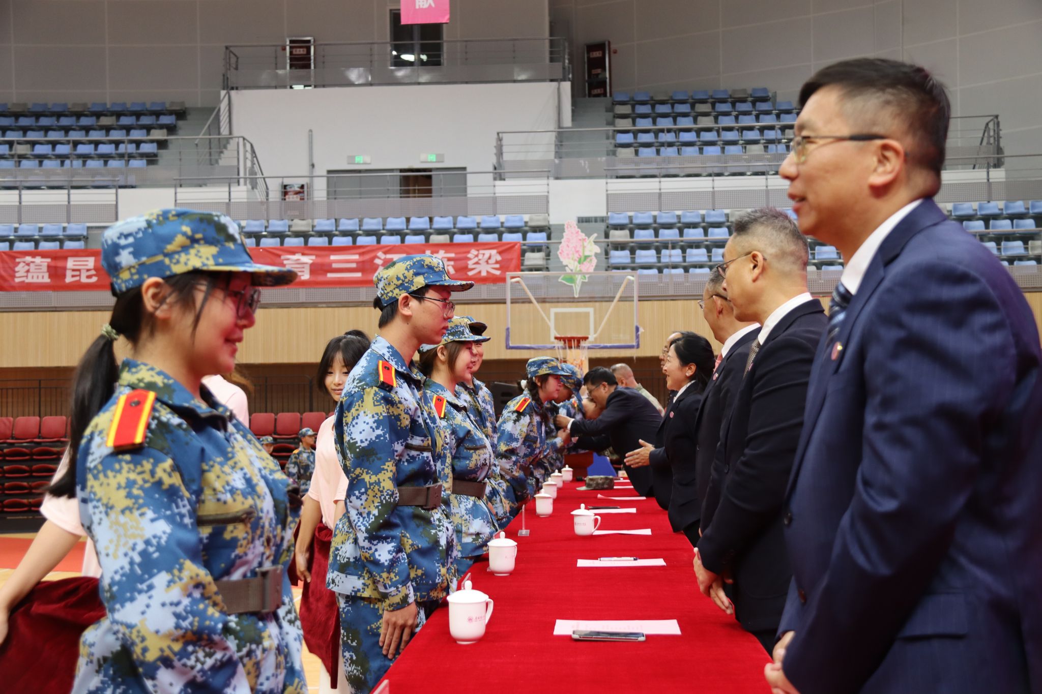 最后,校党委书记王晓英教授为各学院授军训旗帜,鲜红的旗帜迎风飘扬,标志着2025级新生军训正式拉开序幕。接下来,全体新生将开展为期2周的军事训练。